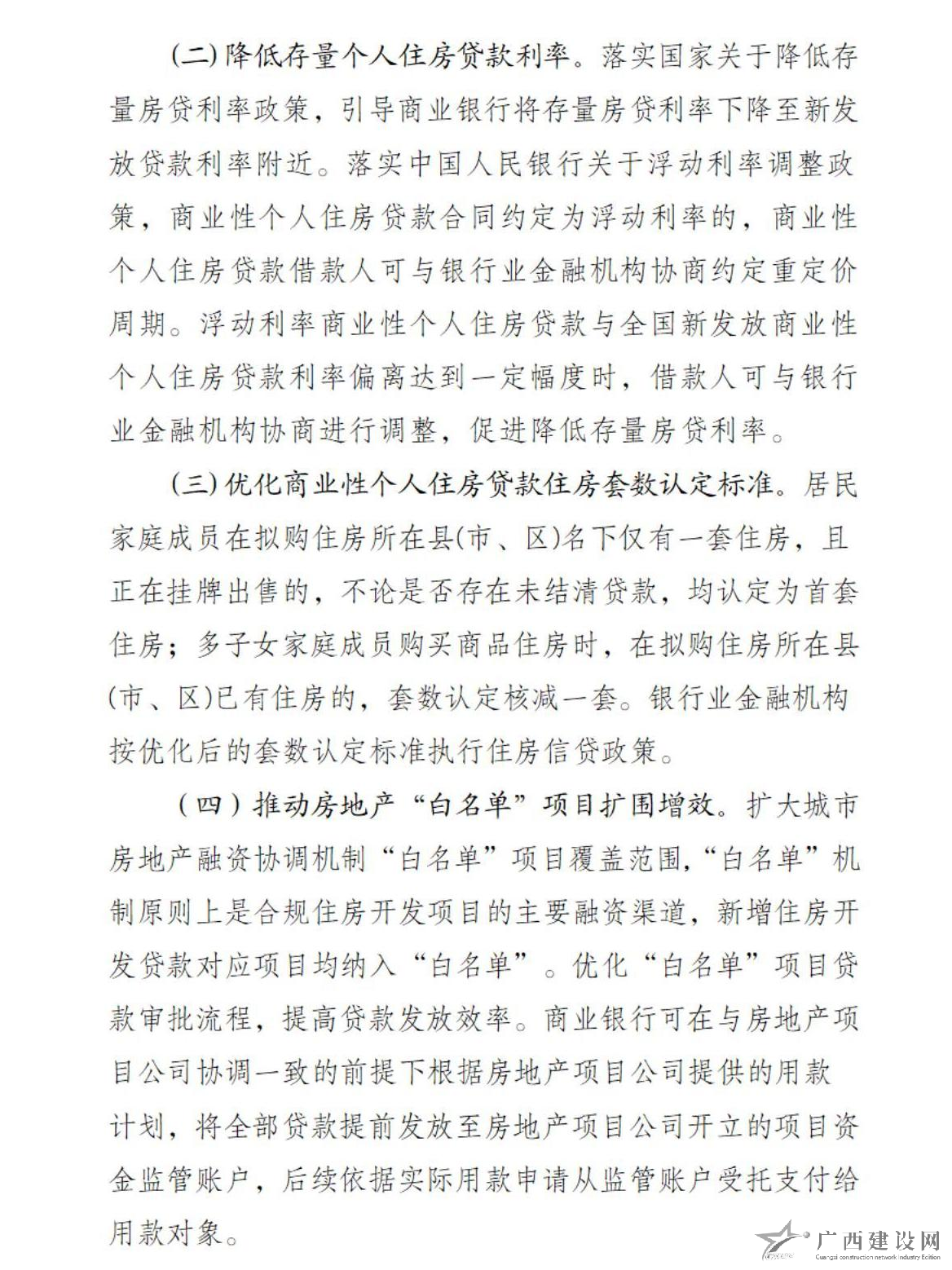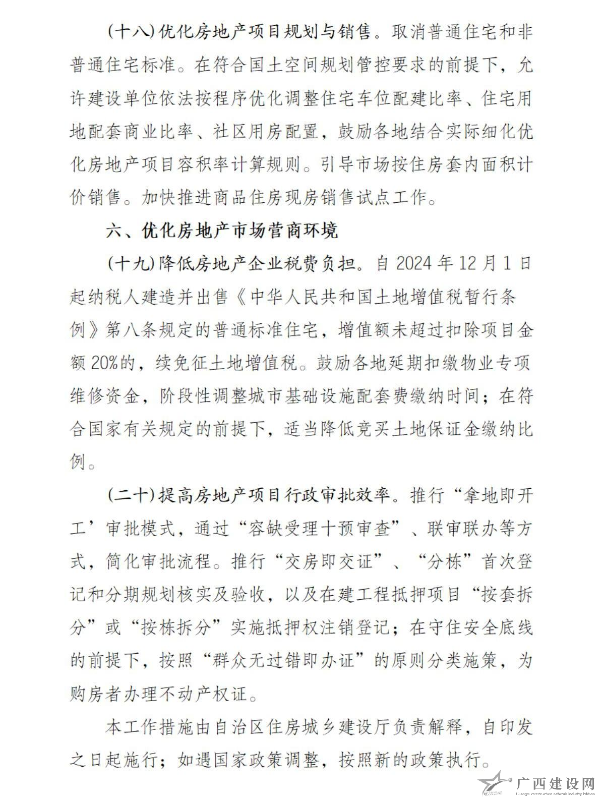 為推動房地產(chǎn)市場筑底回穩(wěn),豐富廣西房地產(chǎn)市場調(diào)控政策,在前期已出臺40多項(xiàng)支持政策的基礎(chǔ)上,自治區(qū)政府再次出臺房地產(chǎn)市場一攬子增量政策措施,再次釋放促進(jìn)房地產(chǎn)市場平穩(wěn)健康發(fā)展的政策紅利。《工作措施》從六大方面提出20條工作措施,全力推動房地產(chǎn)市場止跌回穩(wěn),促進(jìn)市場平穩(wěn)健康發(fā)展。
