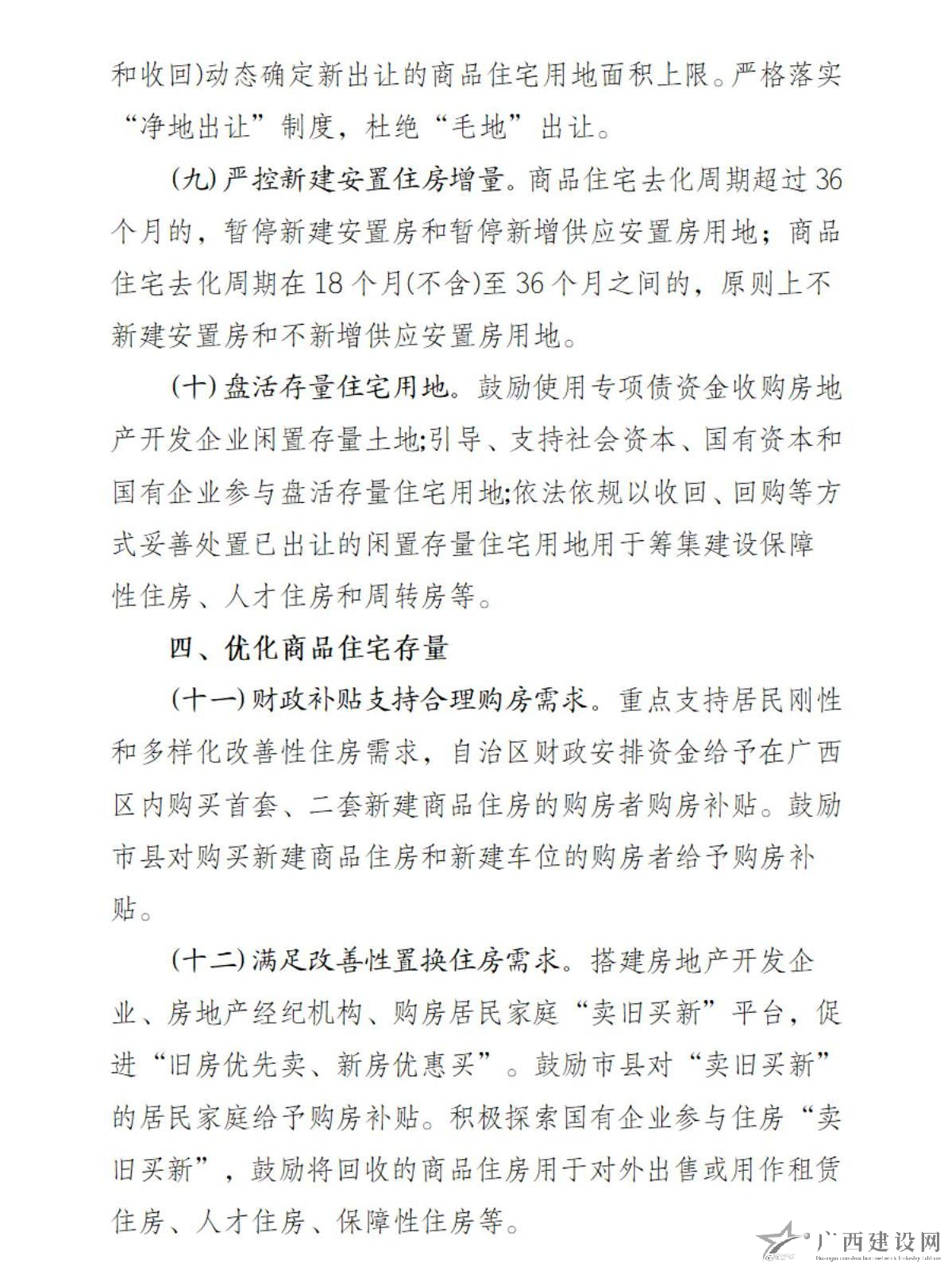 《工作措施》加大力度支持商品住房去庫存。在財(cái)政支持方面,自治區(qū)本級財(cái)政將安排專項(xiàng)資金給予在廣西區(qū)內(nèi)購買首套、二套新建商品住房的購房者補(bǔ)貼,并鼓勵市縣對購買新建商品住房和新建車位的購房者給予購房補(bǔ)貼,申請人可疊加申領(lǐng)自治區(qū)和各地補(bǔ)貼。在支持住房“賣舊買新”方面,明確搭建“賣舊買新”平臺,促進(jìn)“舊房優(yōu)先賣、新房優(yōu)惠買”;積極探索國有企業(yè)參與住房“賣舊買新”,并鼓勵將回收的商品住房用于對外出售或用作租賃住房、人才住房、保障性住房等。在收購存量商品房用作保障性住房方面,明確自治區(qū)財(cái)政安排資金,對收購已建成存量商品房用作保障性住房的國有企業(yè)給予補(bǔ)貼,加快完善“市場+保障”的住房供應(yīng)體系。在安置方式方面,積極推行貨幣化安置,并鼓勵在一定期限內(nèi)保留通過貨幣化安置和使用政府剩余安置房源安置的被征收人子女原所在學(xué)區(qū)的入學(xué)資格。在房地產(chǎn)經(jīng)紀(jì)服務(wù)方面,將進(jìn)一步指導(dǎo)、規(guī)范房地產(chǎn)經(jīng)紀(jì)機(jī)構(gòu)服務(wù)業(yè)務(wù)。
