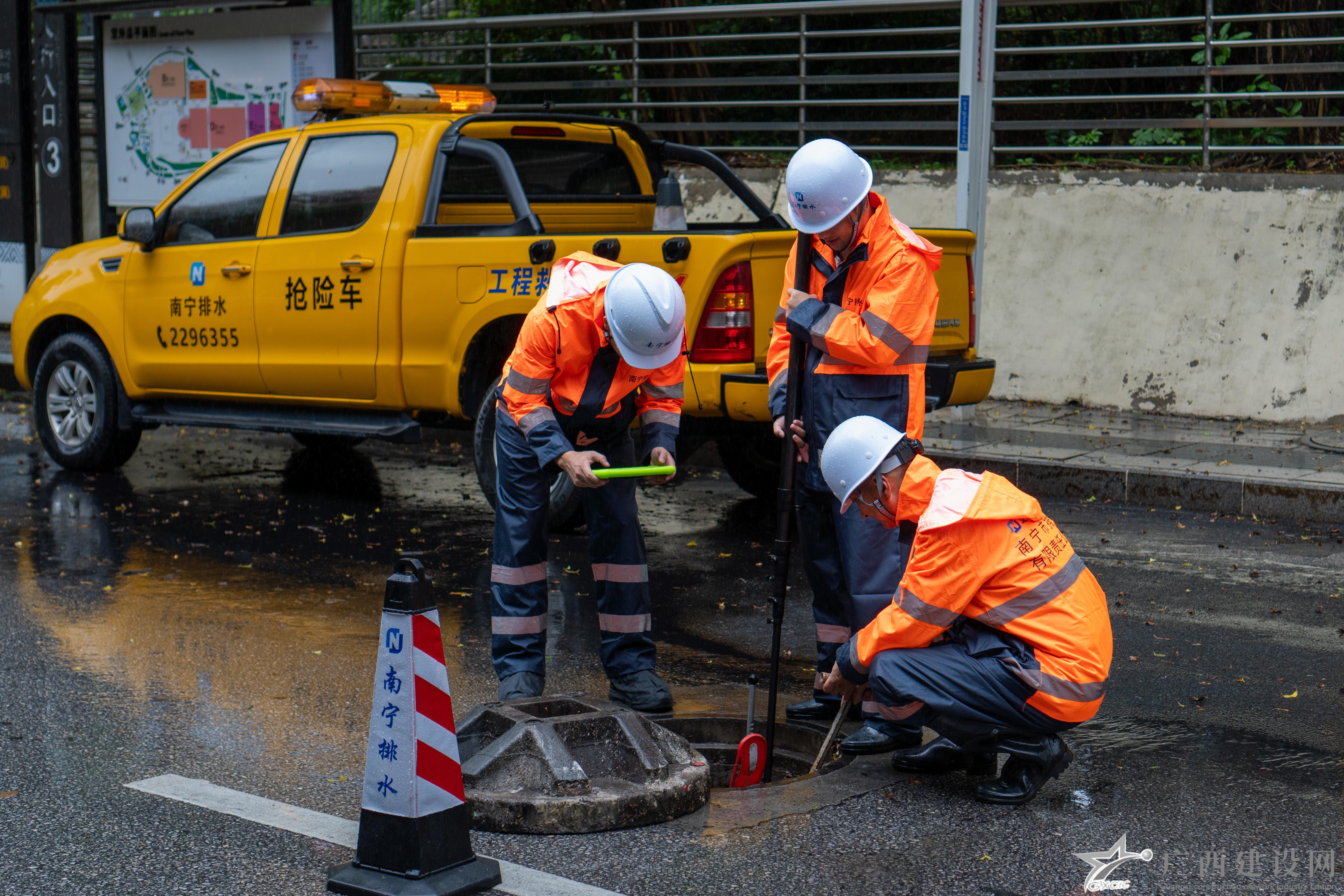 南寧市排水公司工作人員冒雨開展作業,保障重大活動順利進行。梁榆峰/攝