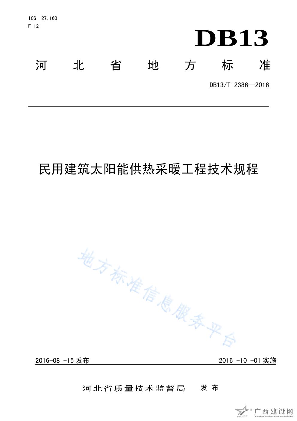 DB13T 2386-2016民用建筑太陽能供熱采暖工程技術規程(河北省質量技術監督局)