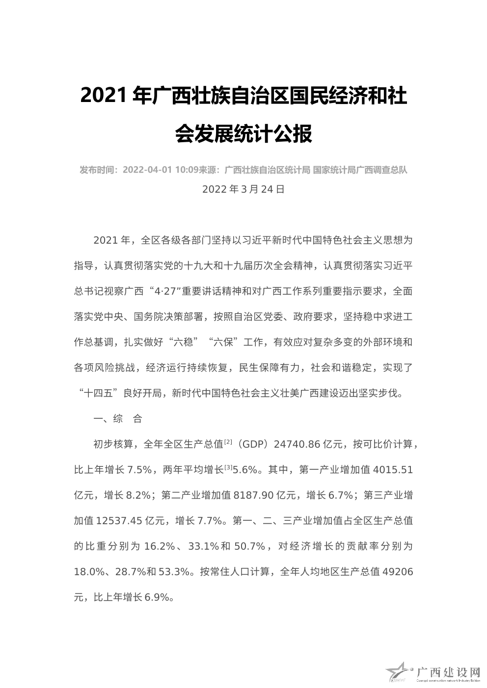 2021年廣西壯族自治區(qū)國民經(jīng)濟和社會發(fā)展統(tǒng)計公報