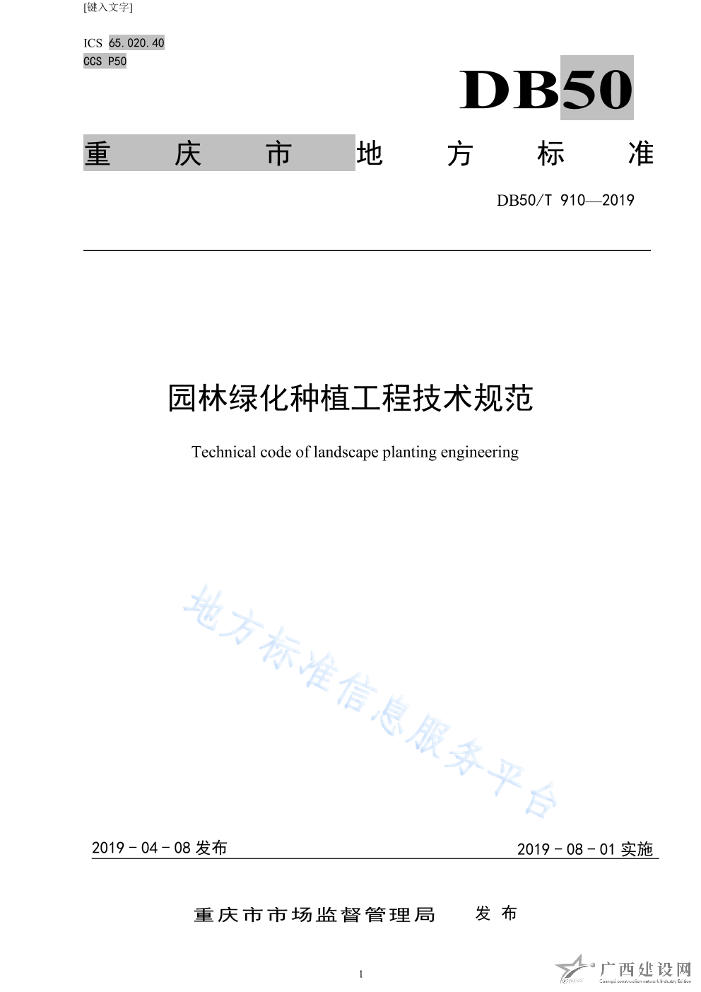 DB50 T911-2019風景園林工程設計文件編制深度規范