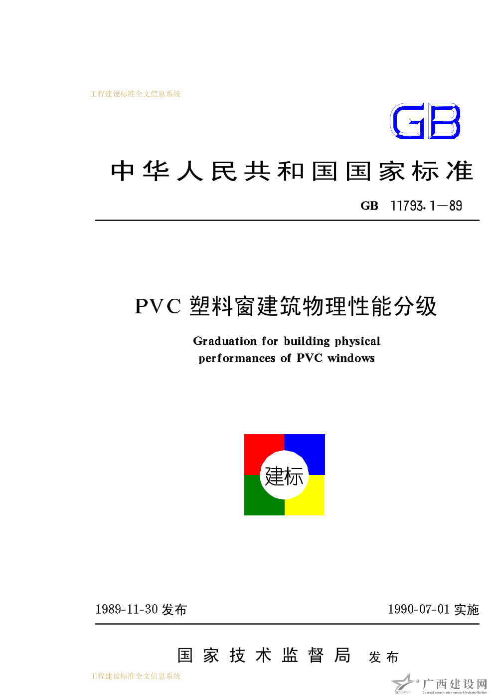 PVC塑料窗建筑物理性能分級 GB11793.1-89