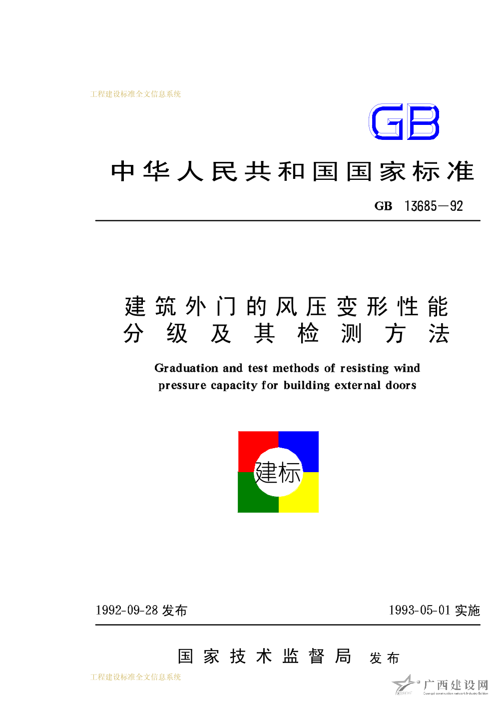 建筑外門的風壓變形性能分級及其檢測方法 GB13685-92