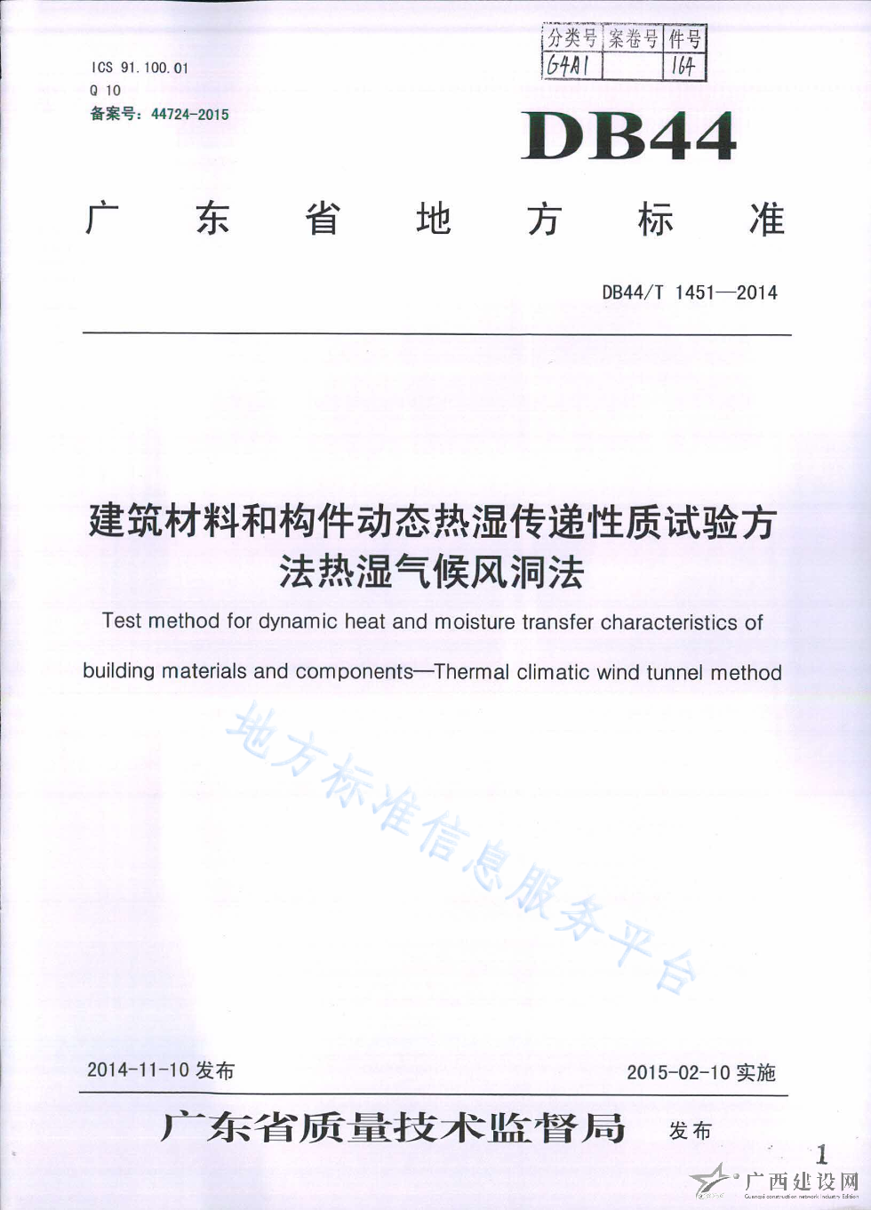 DB44 T 1451-2014建筑材料和構(gòu)件動(dòng)態(tài)熱濕傳遞性質(zhì)試驗(yàn)方法 熱濕氣候風(fēng)洞法